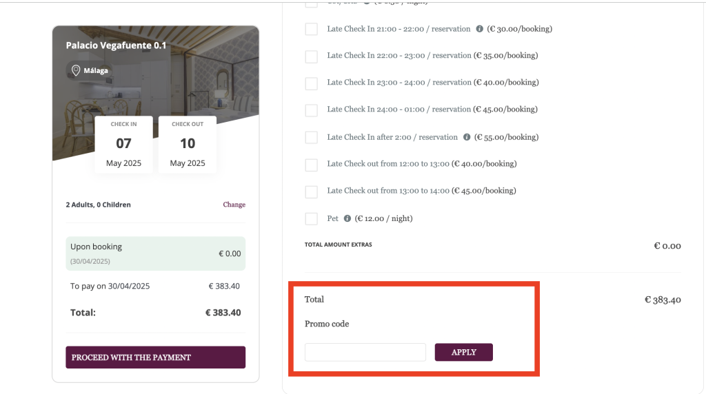 Una vez seleccionado el apartamento, en la parte de pago aparecerá la opción de insertar el código.